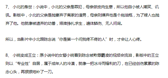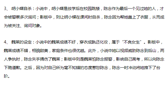 和《七月與安生》一樣,《少年的你》也在原著的基礎上進行大範圍的改編。電影中的人物關係、情節設置與原著大不相同。
