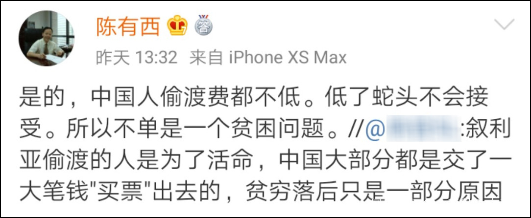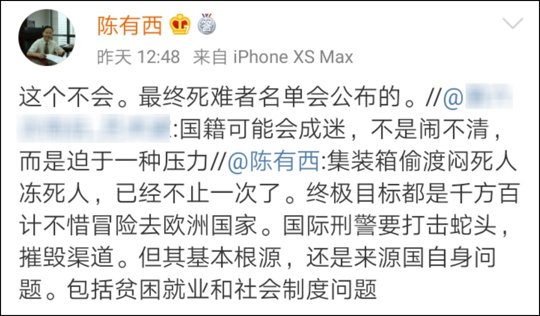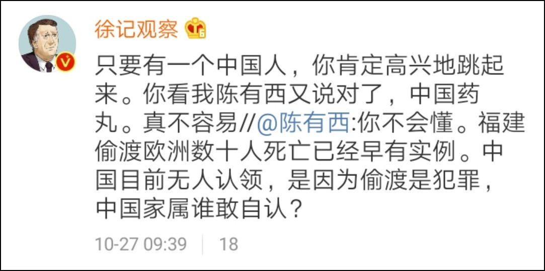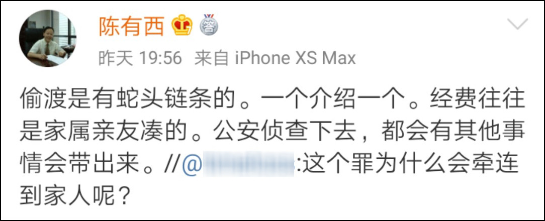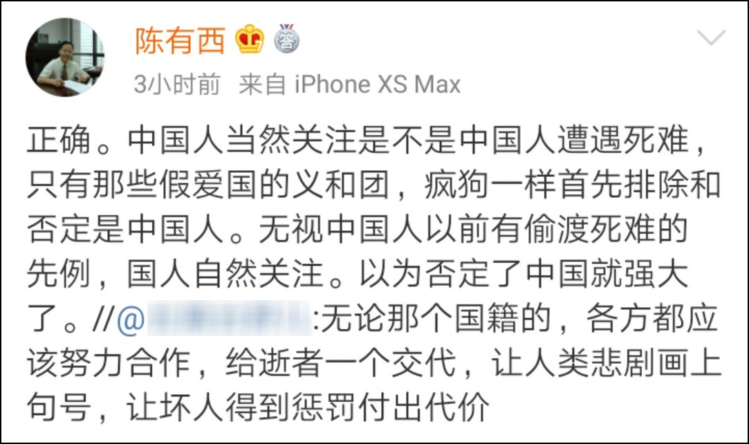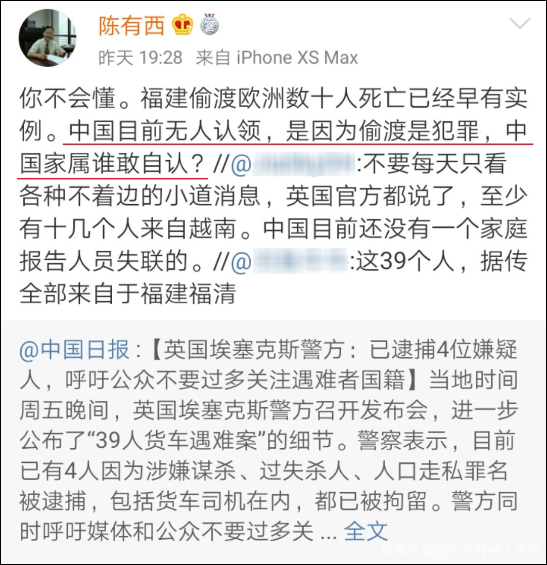 此時,就職於北京某律師事務所的微博大V@陳有西 故作高深莫測狀,稱:“中國目前無人認領,是因為偷渡是犯罪,中國家屬誰敢自認?”