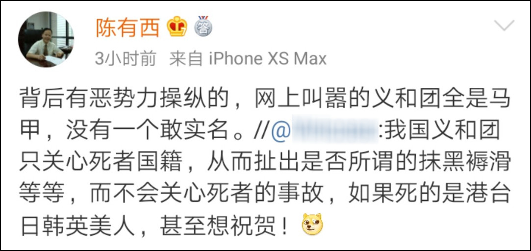 這番話本身是有理的,因為人的本性就是會對於與自己更為相關的事物展現更高的關注度,可是經由陳有西之口,直接扣上一個“義和團”的帽子就讓人很不舒服了。
