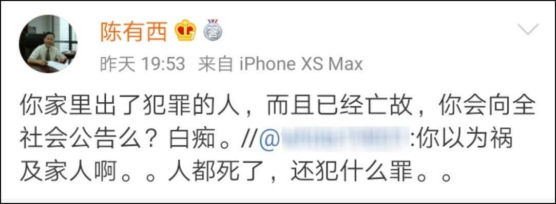 當有網友指責陳有西對於生命太過冷漠時,他卻將遇難者的家屬塑造成罔顧親情,害怕配合警方調查的自私冷血形象,進一步挑撥警民關係。