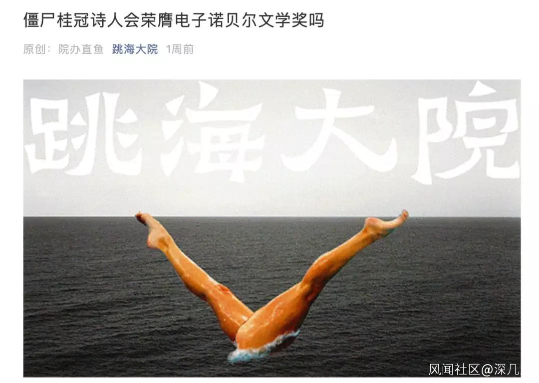 “跳海大院”在一週前推送了一篇名為《殭屍桂冠詩人會榮膺電子諾貝爾文學獎嗎》的文章,這篇文章介紹了今天微博上正在出現的一種現象: