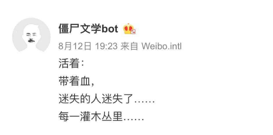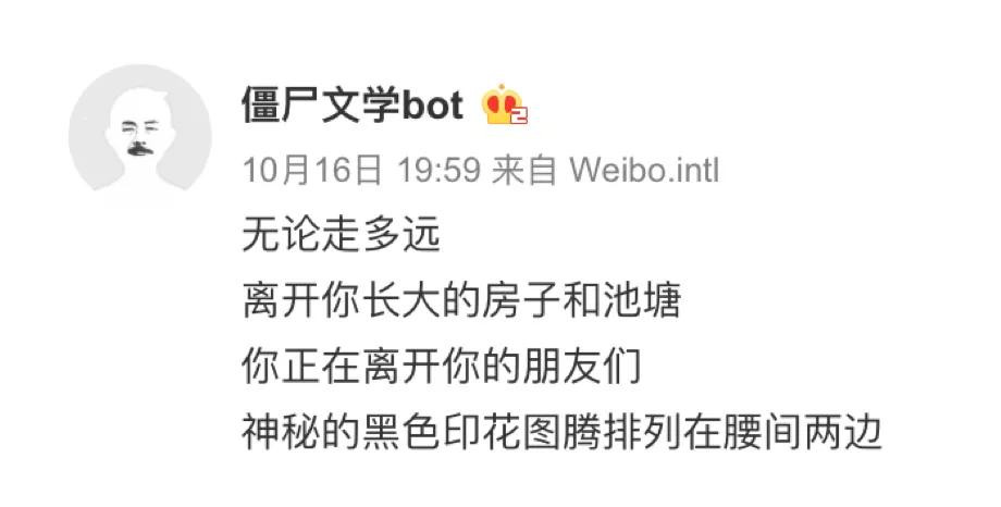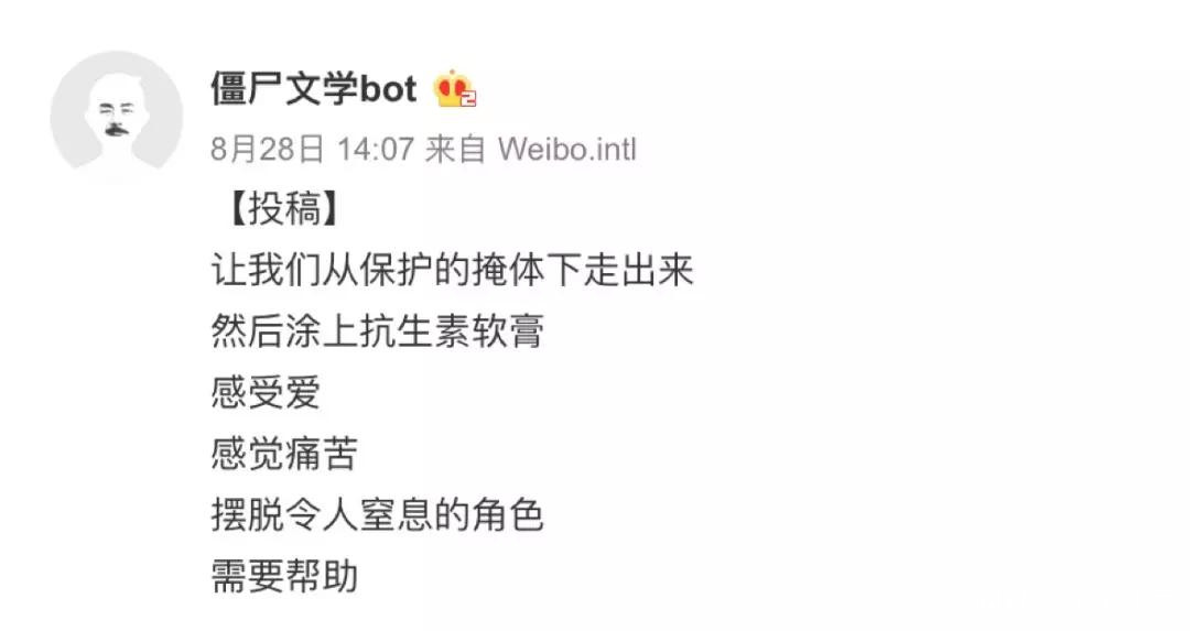 這些內容在“殭屍文學bot”、“唸詩bot”等“無聊”賬號的發掘下,成了一種互聯網現象——“殭屍文學bot”、“唸詩bot”不斷組織網友投稿,寫那些不明所以的微博。