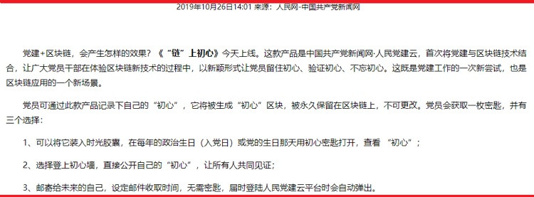 通過這款應用,黨員可以記錄下自己的“初心”,並生成一個被永久保留在區塊鏈上的“初心”區塊。通過生成“初心”區塊時所附帶的密匙,黨員可以定期查看自己的“初心”或選擇在平台上分享“初心”讓所有人見證“初心”。通過這種方式,讓黨員幹部銘記初心。雖然説顯而易見的,不忘初心並不可能單單通過一款應用來實現,它肯定還需要很多更為具體、更為廣泛的工作,但它作為一種黨建形式,無疑是非常正確的。