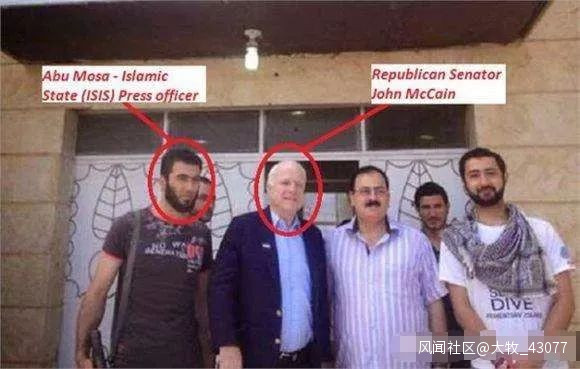 上圖是麥凱恩2011年到利比亞內戰前線“慰問”基地組織頭目的合影,其中最左邊的頭目,後來成為IS的新聞發言人,這張照片流出後不久被擊斃。