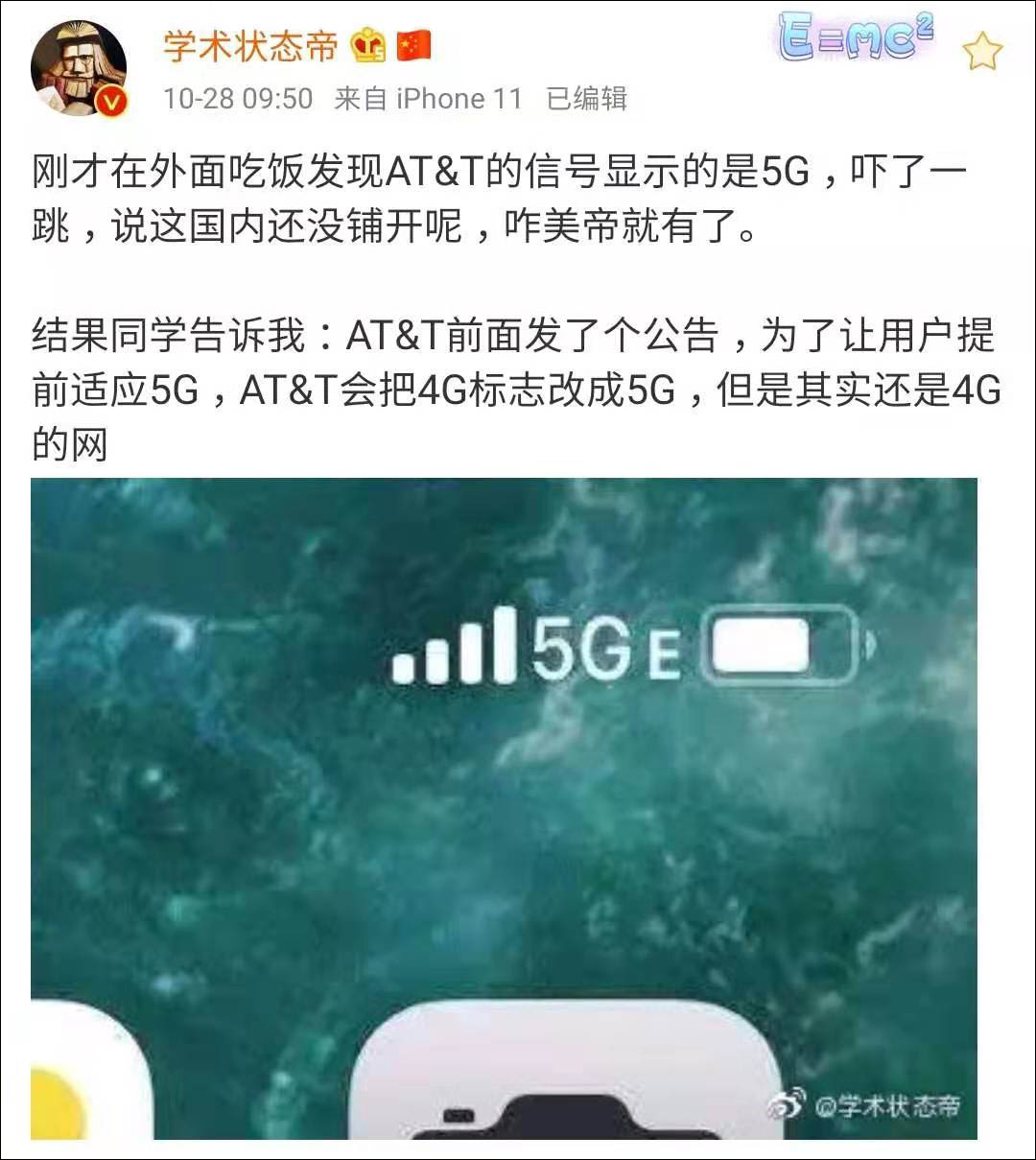 今天上午微博大V爆料説,美國運營商AT&T為了讓用户提前適應5G,把4G標誌改成了5G,但是網還是4G的網。這是什麼迷惑行為!