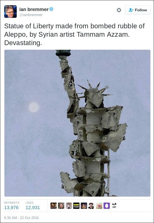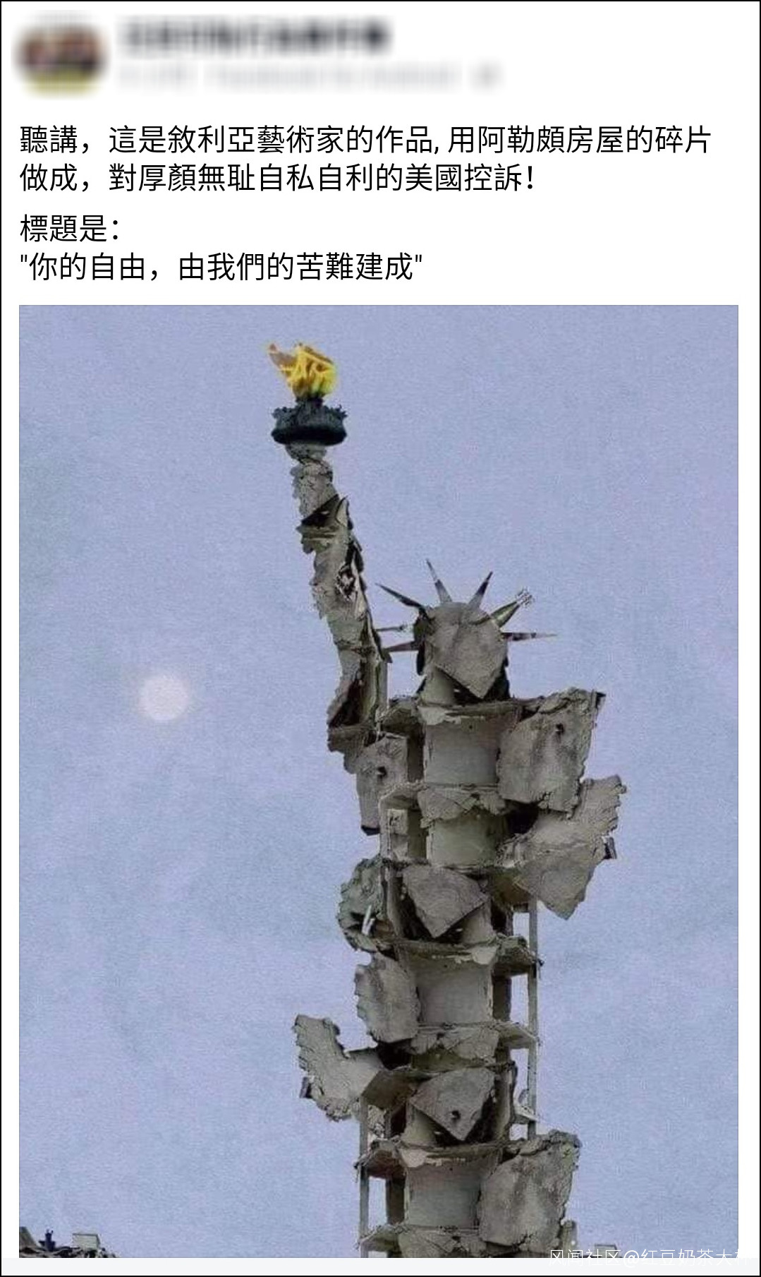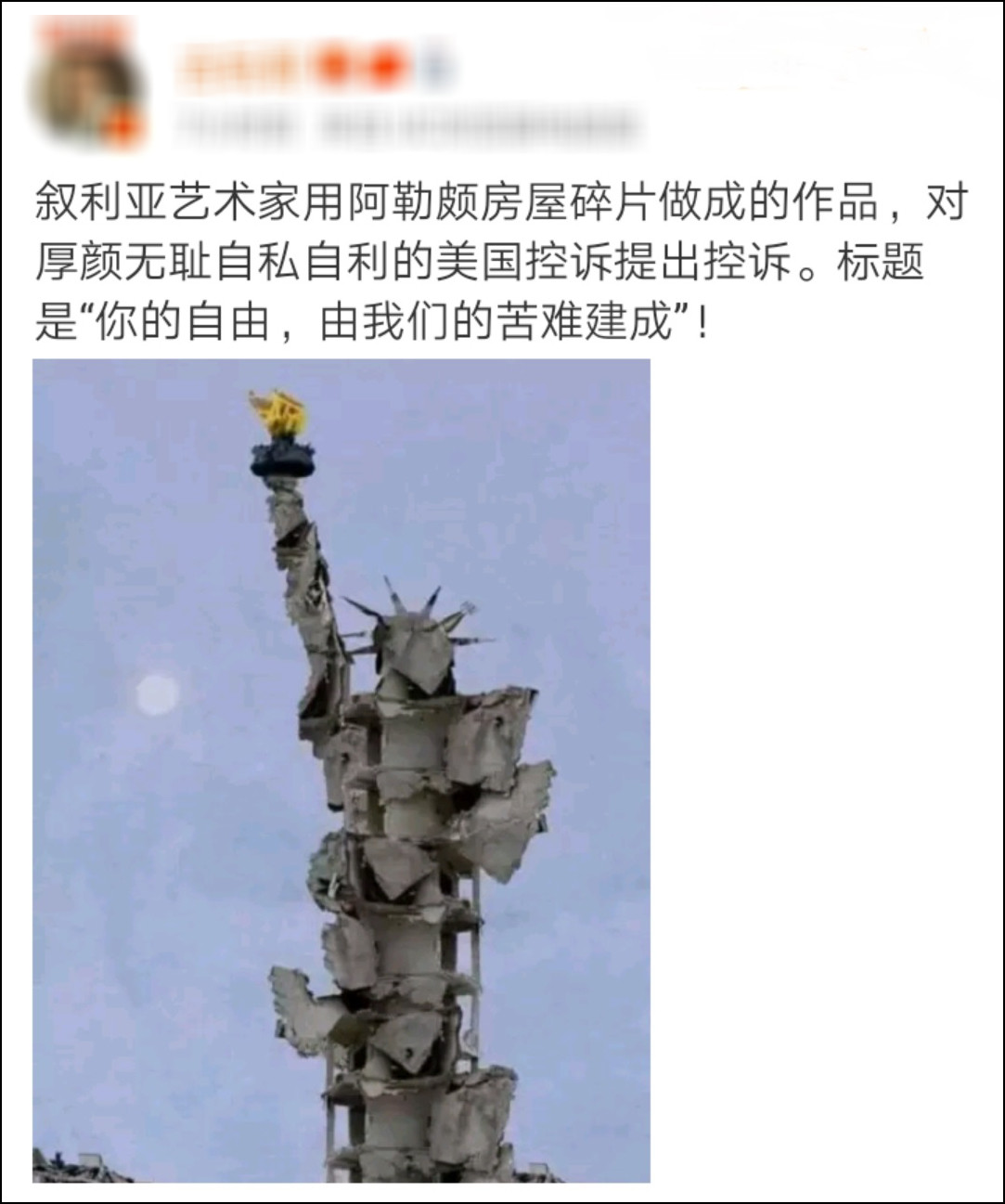 發佈照片的博主介紹,照片中呈現的是敍利亞藝術家利用阿勒頗房屋碎片做成的作品,名稱為“你的自由,由我們的苦難建成”,意在對厚顏無恥、自私自利的美國提出控訴。
