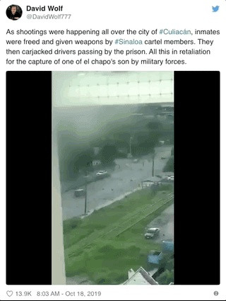 墨西哥錫那羅亞州最大的城市,位於西北部的庫利亞坎Culiacán,經歷了戰亂一般的72小時。軍警出動、毒販進場,城市的核心地區,硝煙瀰漫、槍聲不斷。