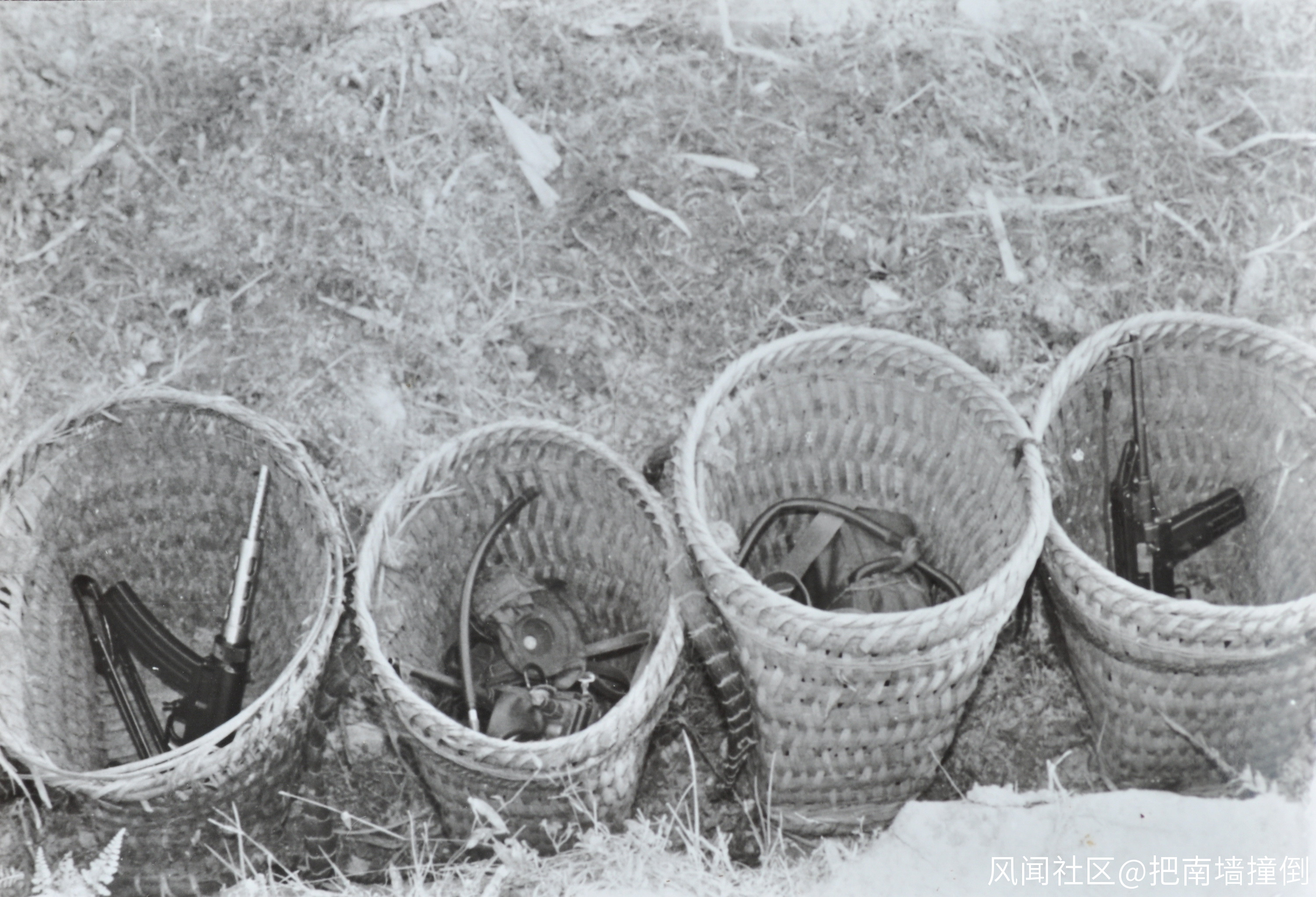 竹簍內揹負的部分裝備。包括通訊器材和自衞武器。注意左1竹簍內為拆掉消音筒的64式微聲衝鋒槍,右1竹簍內為79式輕型衝鋒槍。