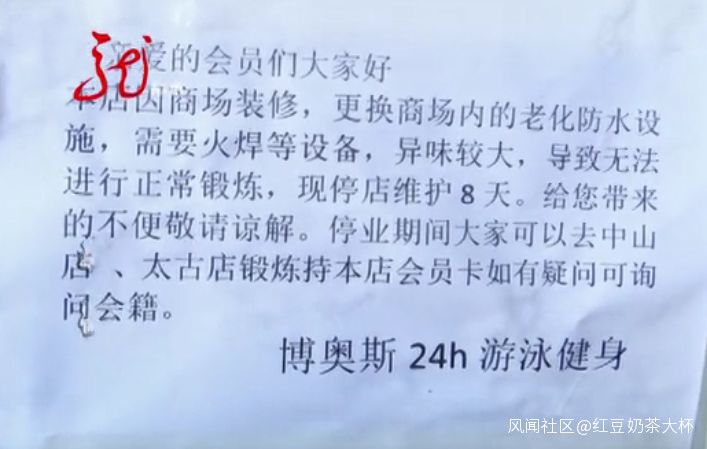 記者來到這家博奧斯游泳健身泰山店時,發現店內並沒有營業,入口處也貼了通知,正在升級改造。
