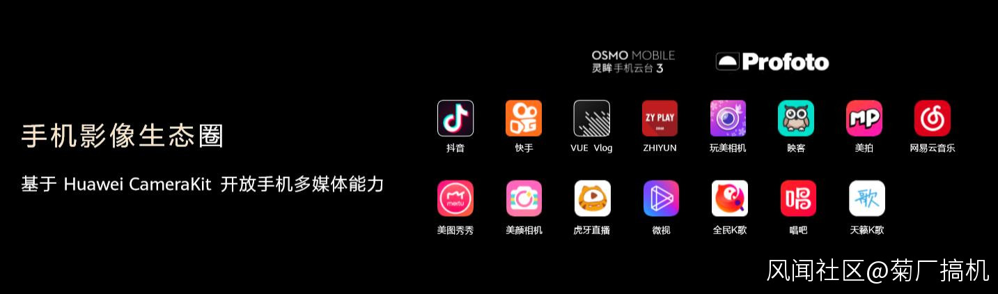 在Mate30系列發佈會上,餘承東在介紹Mate 30系列的拍攝功能時,還請來了兩個“幫手”:**大疆的雲台和保富圖Profoto的閃光燈。**這些合作伙伴的產品都能夠與華為手機協同工作、互助互聯,為用户創造更多更好的拍攝玩法和效果。