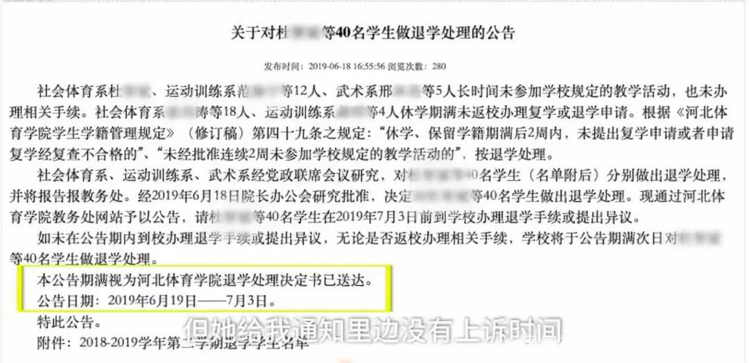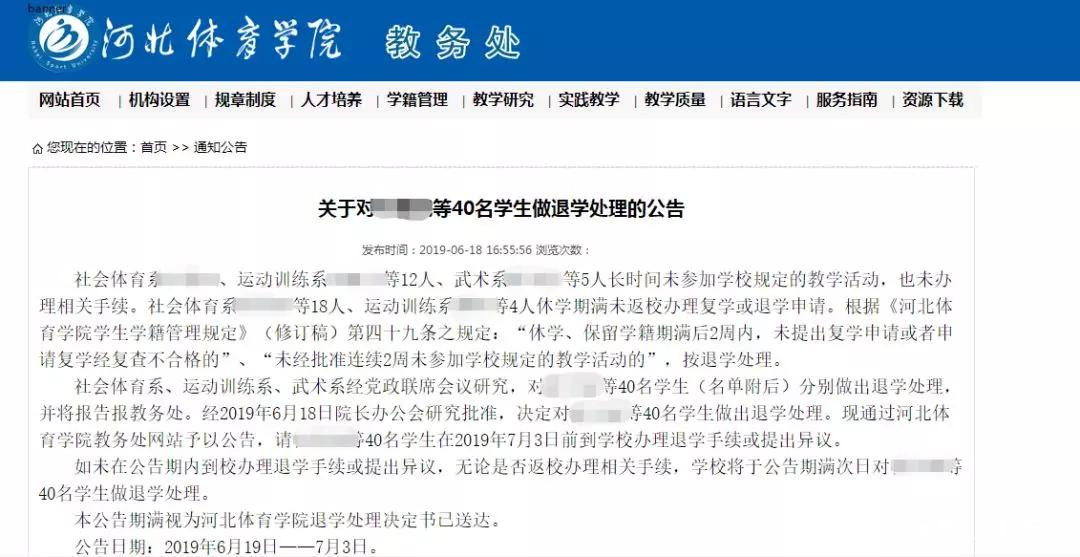 2019年6月18日,河北體育學院教務處通過官網發佈了《關於對XXX等40名學生做退學處理的公告》。公告顯示,此40位同學或因長時間未參加學校規定的教學活動、也未辦理相關手續,或因休學期滿未返校辦理復學或退學申請,根據校規做出退學處理。