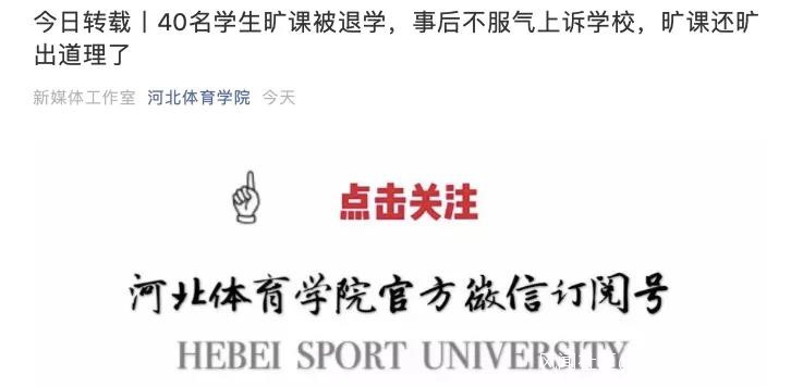 友5日晚8點,事發學校河北體育學院官方微信平台單條推送了一篇名為《40名學生曠課被退學,事後不服氣上訴學校,曠課還曠出道理了》的文章,強硬表明了自己的態度。