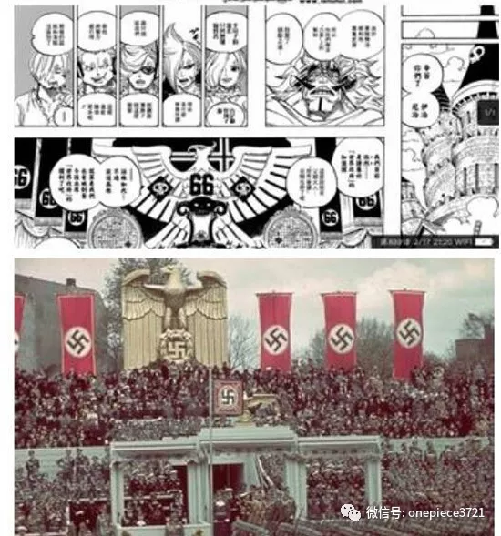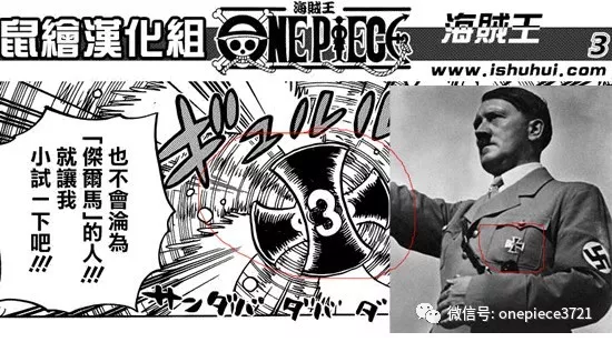 四、再來看看下圖,納粹的表達已經再明顯不過了,有人會説尾田只是表達山治的父親是納粹德國,而山治是紳士,是優秀的好夥伴,這就是尾田厲害之處,潛移默化的表達日本歷史觀,而且是“現實主義”價值觀,我們中國就是太多理想主義,而缺失現實主義思維,所以才會總是吃虧,即使是希特勒,我們也不要完全接受西方給我們宣傳的印象,我們需要獨立思考,建立中國人的一戰二戰價值觀。