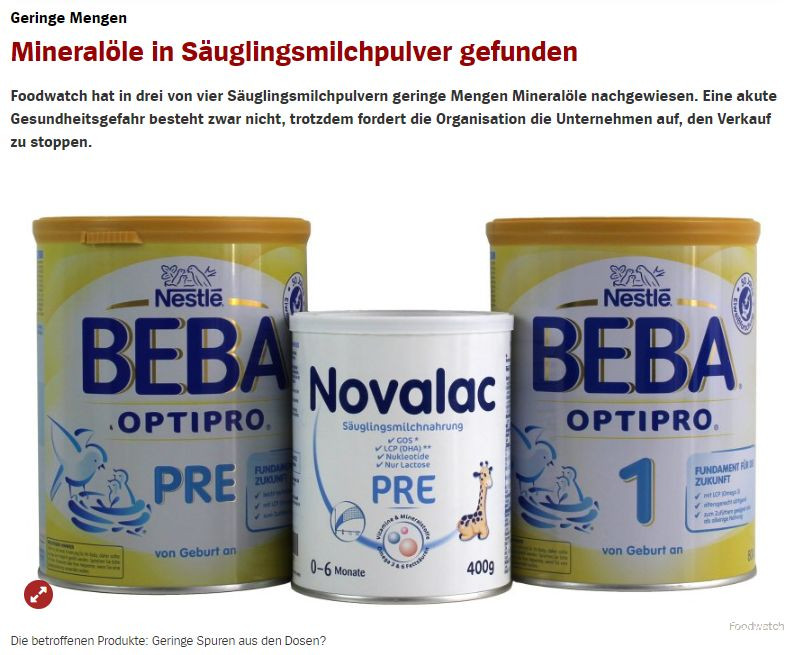 據報道,Foodwatch獨立實驗室在以下三種嬰幼兒奶粉中都檢測出了可致癌礦物油成分,每千克奶粉中的芳香烴含量在0.5毫克到3毫克之間:雀巢貝巴Beba Optipro Pre段(800 克)、雀巢貝巴Beba Optipro 1段(800 克)、新諾兒Novalac Säuglingsmilchnahrung Pre段(400 克)。