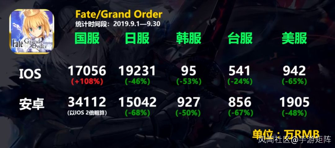 首先自然是國服收入大幅提升,助力《FGO》衝上第一。在這裏需要額外解釋一下的是,SuperData與Sensor Tower、APP Annie等機構各有各的數據估算模型,所以我們經常在不同機構公佈的榜單上看到不同的第一名,但《FGO》在9月的成績是各大機構平台公認的強。而且《FGO》在9月登上SuperData全球手遊收入榜第一,是其日服收入相比8月出現下滑、國服收入大幅提升實現的。據SuperData報告顯示,《FGO》9月的收入為2.46億美元,幾乎是8月份的兩倍。