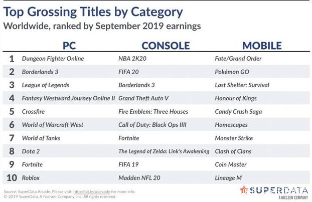 西邊不亮東邊亮,以中國為代表的東半球市場迎來了大幅收入增長。其中除了《地下城與勇士》、《夢幻西遊2》、《穿越火線》等幾款標誌性網遊外,手遊《FGO》也在9月份的收入達到2.46億美元(SuperData估算),比8月份上升了88%。更有甚者像《無主之地3》,官方對中文版的製作和宣發都花費了大量的心血,更是專程找人制作了四川方言版等其它配音版本的宣傳片。雖然目前暫時還沒有《無主之地3》在國內的銷量數據,但相信這個成績也會非常驚豔。