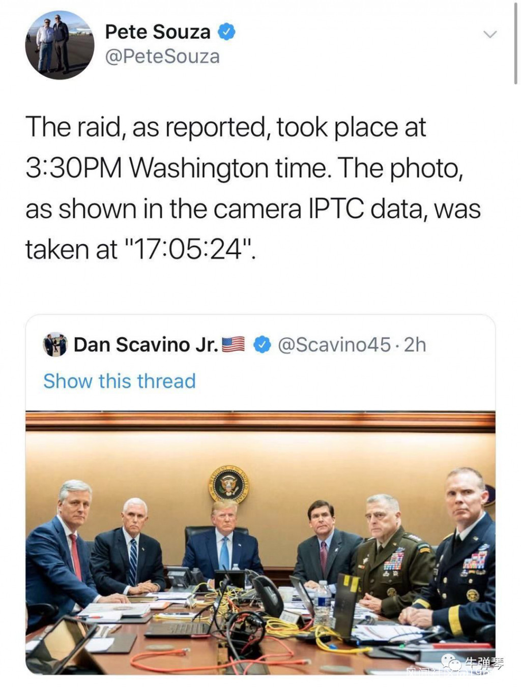 7,當然,拍了奧巴馬那張照片的御用攝影師就説,特朗普團隊所有人,目光都看着一個鏡頭,更像是擺拍。有人更從時間推斷,突襲巴格拉迪發生在華盛頓時間下午 3:30,而白宮照片顯示是攝於下午 5:05,因此不排除真是事後的補拍。這些是照片上直接呈現的信息,還有一些與照片和事件相關聯的細節,也很有意思。