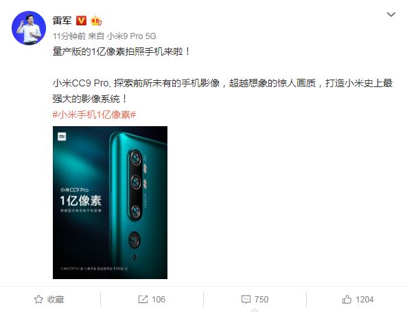 今天上午,雷軍在自己的微博上官宣小米CC9 Pro將成為第一款量產版的1億像素拍照手機,並稱小米CC9 Pro將“探索前所未有的手機影像,超越想象的驚人畫質,打造小米史上最強大的影像系統!”