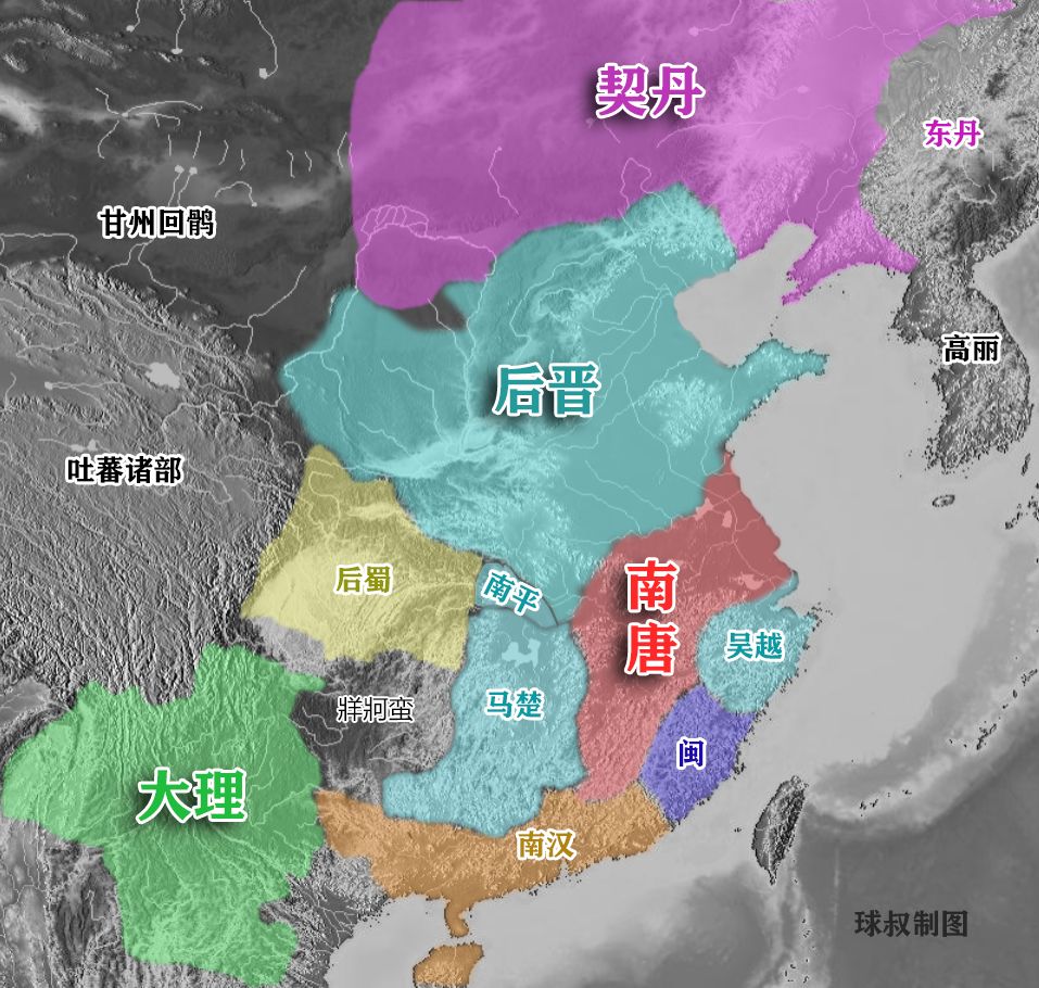 同在937年,南方的徐知誥在建康稱帝,割據了長江下游地區,因為北方中原的後唐已經滅亡,所以他決定改名李昪,改國號為唐,表明自己繼承的正統性,這便是歷史上的南唐。從南唐的角度來看,他們認為自己是唐朝的繼承者,讓唐朝的旗號保持到了之後的大宋時期。