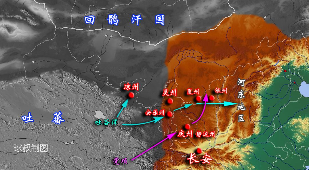 除了從西北而來的沙陀人,前文我們説過在長安西北的靈州、慶州一帶還有大量的吐谷渾人和党項人,他們都是吐蕃吞併吐谷渾後東遷而來的。吐蕃之後繼續向唐朝進攻,這些吐谷渾人和党項人繼續東遷到了長安北部的夏州、銀州一帶。其中的党項人將在兩百多年後成為中原王朝的心腹大患,這是後話了。