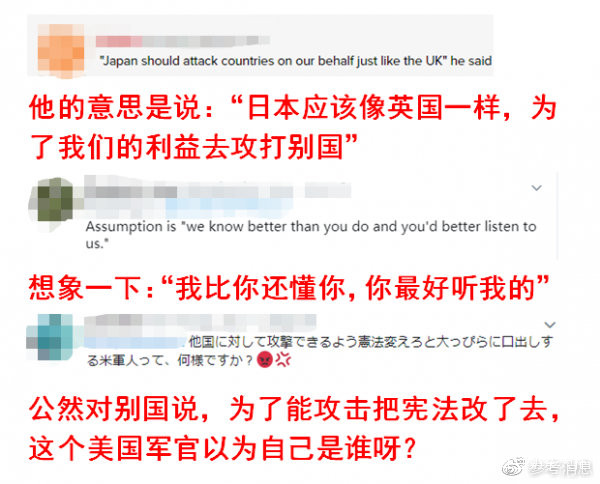 這篇報道於10月28日被今日日本網轉載後,輿論對這名軍官的話不乏批評聲音。有日本網友難掩憤怒地回懟:你以為自己是誰?