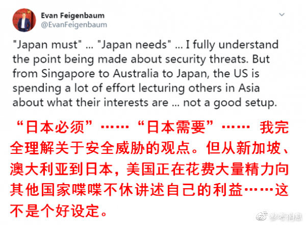美國前國務院亞太事務高級官員、卡內基國際和平基金會的埃文·費根鮑姆在社交網站上批評美國對盟友指手畫腳。
