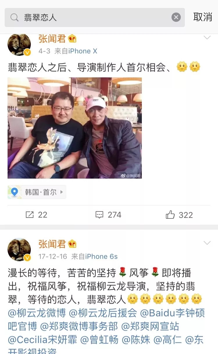 雖然官方宣傳渠道幾乎處在停歇狀態,但從與作品緊密關聯的出品方、製作人等方面的動態或可以管窺一些訊息。《翡翠戀人》的製片人張聞君更博頻繁,直到2017年底仍發微博期待該劇能夠上線,今年四月還與導演在韓國首爾見面,並回復劇粉評論表示“我和大家一樣在等”。就在這兩天,他的微博定位又出現在了韓國。可以試想,雖然各方明面上不再大肆宣傳,但是並沒有就此放棄作品,無不暗自期待、甚至勉力撮合劇集得以播出。