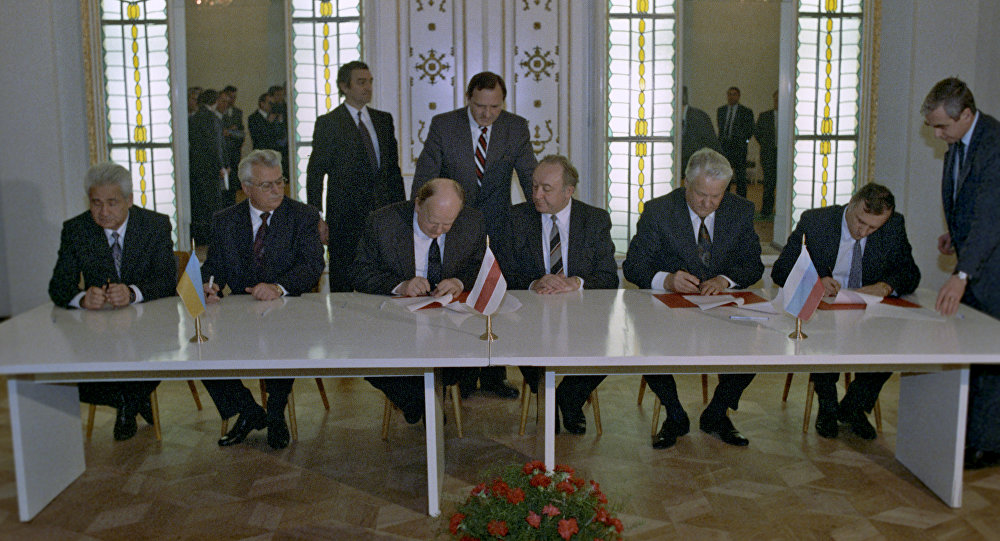 實際上,前蘇聯在1991年12月25日解體,當時戈爾巴喬夫呼籲蘇聯人民讓其完成總統任期。在此之前,俄羅斯、白俄羅斯和烏克蘭的領導人於12月8日簽署了一項協議,該協議宣佈蘇聯解體,並宣佈成立獨立國家聯合體。這一協議在歷史上被稱為《別洛韋布日協議》(又稱明斯克協議》,全稱《關於建立獨立國家聯合體的協議》)。