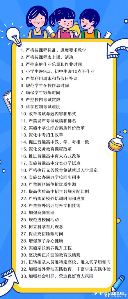 浙江省教育廳官方微博@教育之江 還整理了《浙江省中小學生減負工作實施方案(徵求意見稿)》中的主要內容,見下圖:
