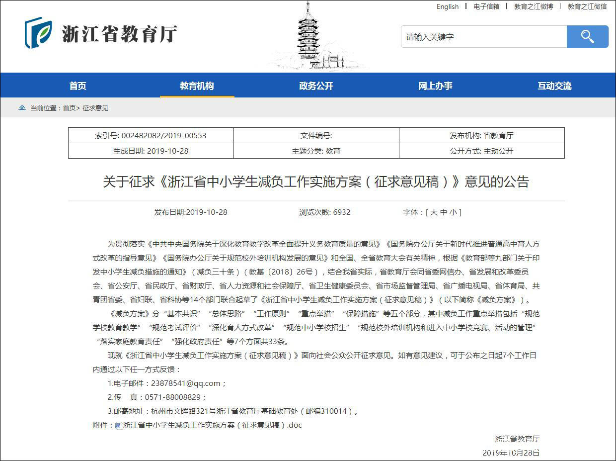 翻頁查看《浙江省中小學生減負工作實施方案(徵求意見稿)》全文: