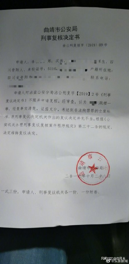 10月29日,@曲靖警方 發佈《關於李某池跳樓受傷一事複核情況的通報》: