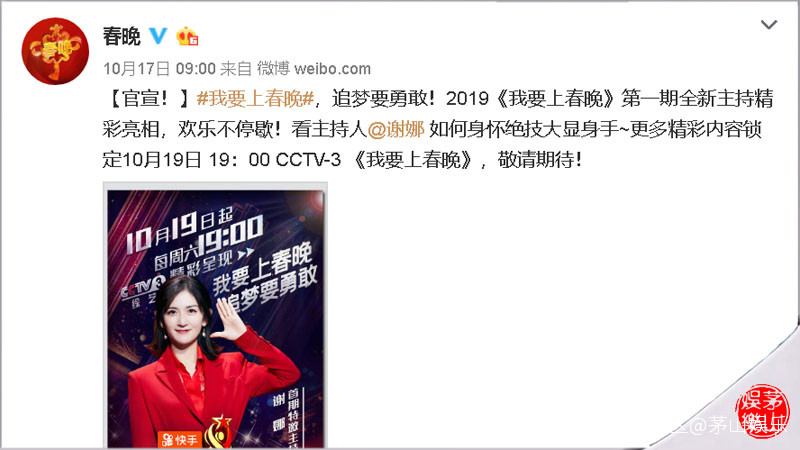 10月14日,央視“春晚”官博發佈官宣消息,稱2019年第一期《我要上春晚》全新主持精彩亮相,原來這期是由湖南衞視綜藝一姐謝娜獨挑大樑。這個消息一出,就像是在平靜的湖面丟下了包TNT炸藥,瞬間把《我要上春晚》的熱度給引爆了,為什麼會這麼厲害?因為謝娜不光是湖南衞視綜藝一姐,人家還是微博女王,坐擁1.24472713億粉絲的微博一姐,人家在網上有着不計其數的擁躉。
