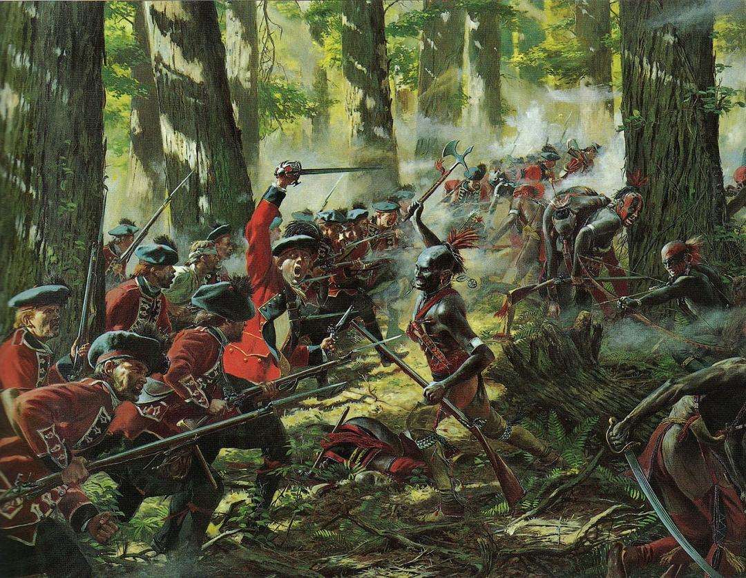 描繪七年戰爭北美戰場,英軍的蘇格蘭高地兵與法國盟友休倫族印第安人交戰的畫作