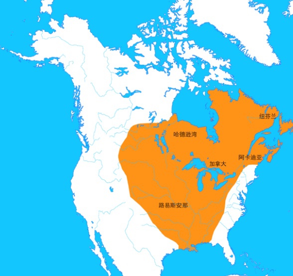 約1713年新法蘭西的各個組成部分:紐芬蘭、哈德遜灣(原歸英國)、加拿大、阿卡迪亞、路易斯安那