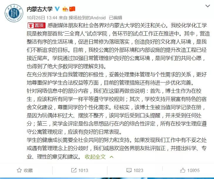 針對媒體報道“女博士牀上放玩偶被通報批評,影響獎學金評定”一事,內蒙古大學回應稱,該博士生被當值同學記錄在冊,是因為玩偶體積過大、擺放不整齊,“該同學後受到口頭提醒,並未受到任何處分”,“今年評獎學金,前兩天該女生已經評上了”。