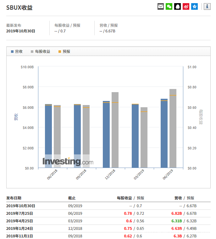 英為財情數據顯示,分析師普遍預期9月季度星巴克的營收將同比增長5.8%至66.7億美元,每股收益預計為0.7美元,去年同期為0.62美元。