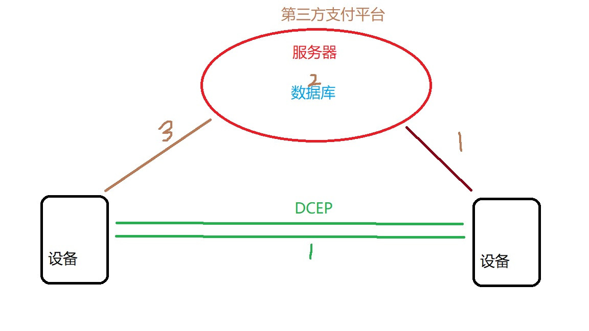 然後相信很多瓜黨都好奇現在中國推出這個DCEP和支付寶,微信支付,雲閃付有什麼區別。一個最重要的區別就是DCEP支持點對點的支付,通俗的説就是兩台設備可以脱離網絡進行交易。下面是我隨手畫了一個圖,主要展現了兩種電子支付方式。