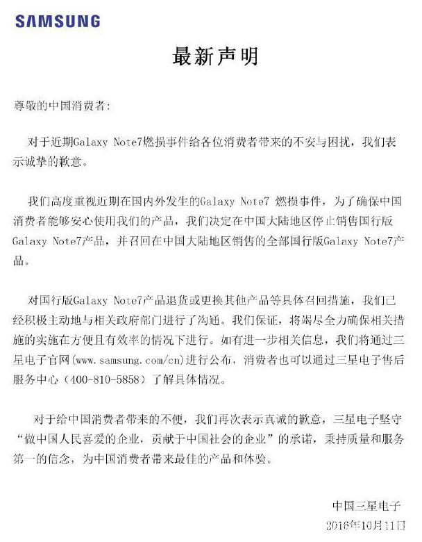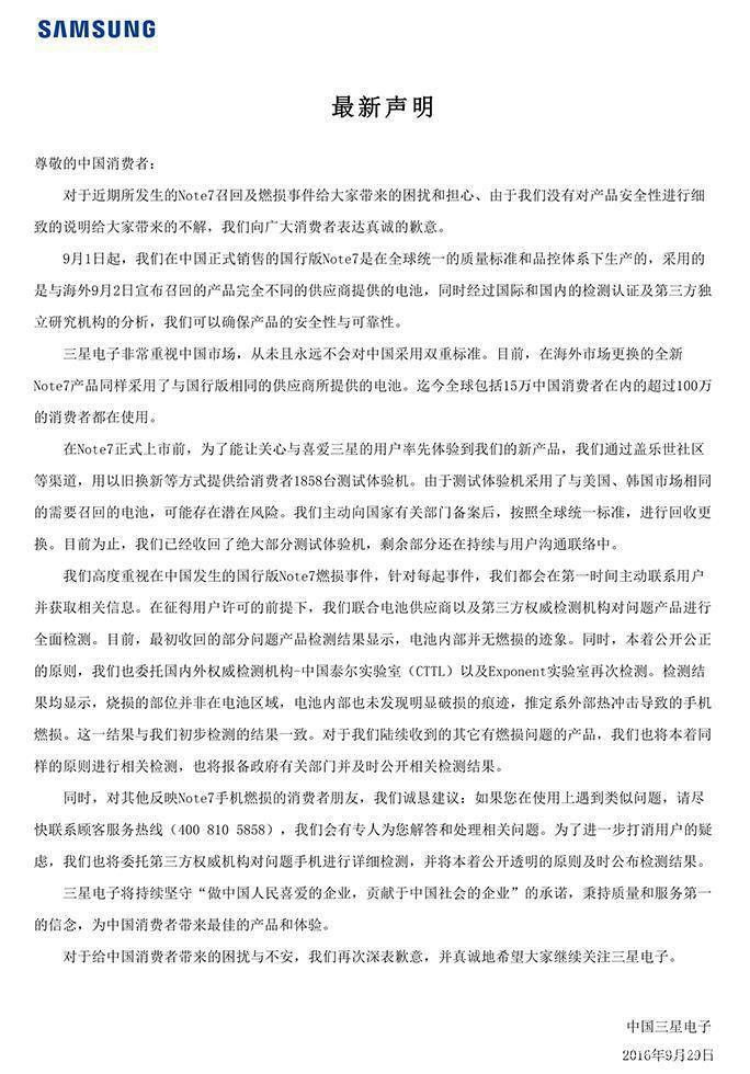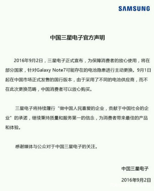 時間回到Galaxy Note 7上市後的第二天,三星便在美國接到關於Galaxy Note 7爆炸的投訴,到了9月2日,三星在全球範圍內接到有關Galaxy Note 7電池過熱的報告總計35起。隨後,三星宣佈在韓、美等10個市場實施召回,總計逾250萬台。——但是,此次的召回並不包含中國大陸地區。三星給出的解釋,在他9月2日的聲明中寫得清清楚楚。