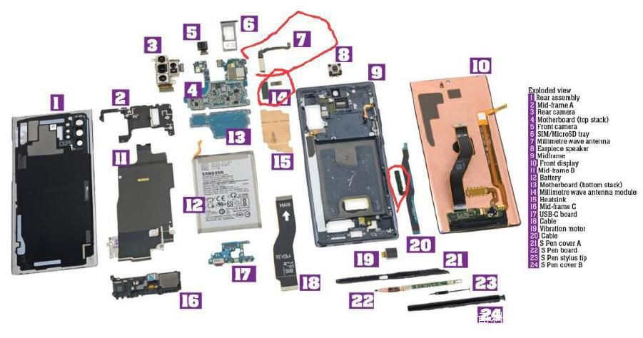 這位博主像是撿到寶了,馬上回復到:“今天給李副總裁科普一下,國際版note10+有三個毫米波模組,但國行呢刪掉了兩個(7、14),因為國內目前用不到。但副總裁説沒有,是他用愛幫中國消費者拆掉了嗎?”並貼上了一張國外的拆機圖。