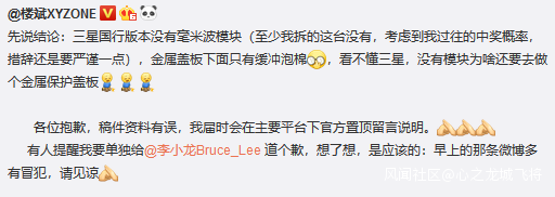 隨後,首拆Galaxy Note10+ 5G版的中國版的評測人樓斌發佈微博,正式因為拆機的不專業向李小龍道歉。