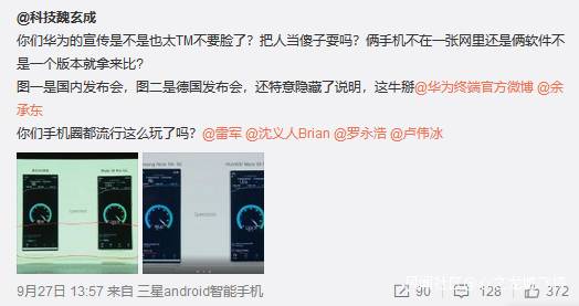 這條微博內容,博主公開質疑華為在網速對比上的信息,不在同一張運營商網絡,不是同一個版本軟件,那麼這種對比是沒有意義的。