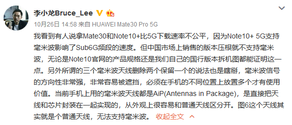 李小龍這條回覆,基本上給這件事做了定性,就是三星Galaxy Note10+ 5G版的中國版,是沒有毫米波天線的。而國際版,則有這個天線,用來支持5G毫米波網絡。