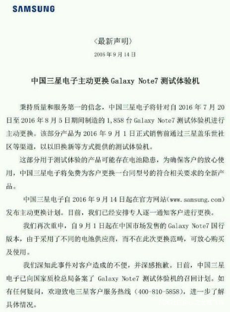 問題是, 9月2日,網友@吉娃娃你發佈微博,稱自己9月2日到貨的京東國行Galaxy Note 7珊瑚藍突然爆炸,國行首炸到來,隨後,中國大陸也相繼發生了多起國行Galaxy Note 7手機爆炸事故,三星通過送檢的兩部手機鑑定結果為“外部加熱”,進而向中國大陸公開聲明中國所銷售的那個新手機是安全的。但是出於某些不可描述的原因,三星還是在9月14日發佈聲明,對中國區進行召回,數量是巨大的“1858”台。
