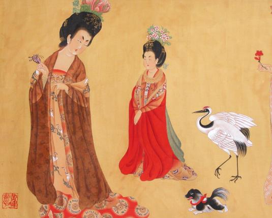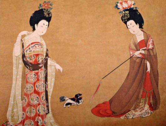 在中國,寵物狗是什麼時候出現的呢?至遲在唐代,小型觀賞犬已經成了貴婦圈的寵物,描繪唐朝貴婦生活的周昉《簪花仕女圖》(遼寧省博物館藏)便畫了兩隻小巧玲瓏的寵物犬。這種小型觀賞犬叫做“拂菻狗”,唐初從高昌傳入,“高六寸,長尺餘,性甚慧,能曳馬銜燭,雲本出拂菻國。中國有拂菻狗,自此始也。”又稱“猧兒”,極其名貴,只有宮廷貴婦才養得起。