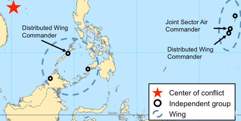 將指揮控制結構改成這樣的主要原因在於(如4.1所示,JFACC的指揮控制要通過遠程通信實施),遠程通信可能會被破壞。因此我們設想,聯合戰役行動區域可能需要分為多個能獨立運行的分區。在通信可靠期間,聯合戰役司令部可以調配各個分區的資源。但是在通信遭到嚴重干擾的時候,聯合戰役指揮官將依賴分區指揮官繼續指揮。這種分區指揮方式看起來似乎是退回到了越戰時期的方式,當時類似的體制中,因為缺乏統一領導,分區指揮官會為了爭奪資源和獲得使用資源的權力而發生衝突。不過在這個新體制下,與越戰時期不同,每個分區的空軍指揮官實際上只是同一個上級的代理人,也就是聯合戰役司令部空軍指揮官,他有權跨戰區調動和分配戰鬥機。而在分佈式作戰環境下, 分區空軍指揮官要依照戰區空軍指揮官最後的命令完成若干指定的任務。