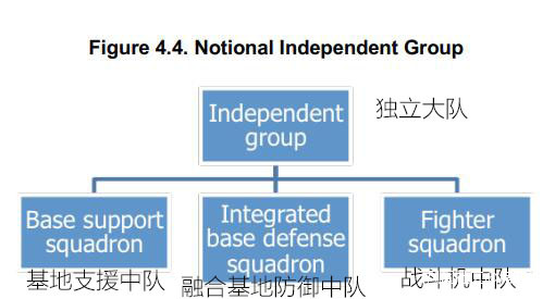 如圖4.4所示,每個分佈式聯隊由若干獨立大隊構成,而獨立大隊下屬一個戰鬥機中隊和一個基地支持和防禦單位。大隊將會部署在“駐留域作戰”基地。大隊還要負責其周邊可用的前進基地和FARP臨時基地的選址、防禦和相關工作,以便其下屬的戰鬥機中隊可以在衝突中進駐這些基地。