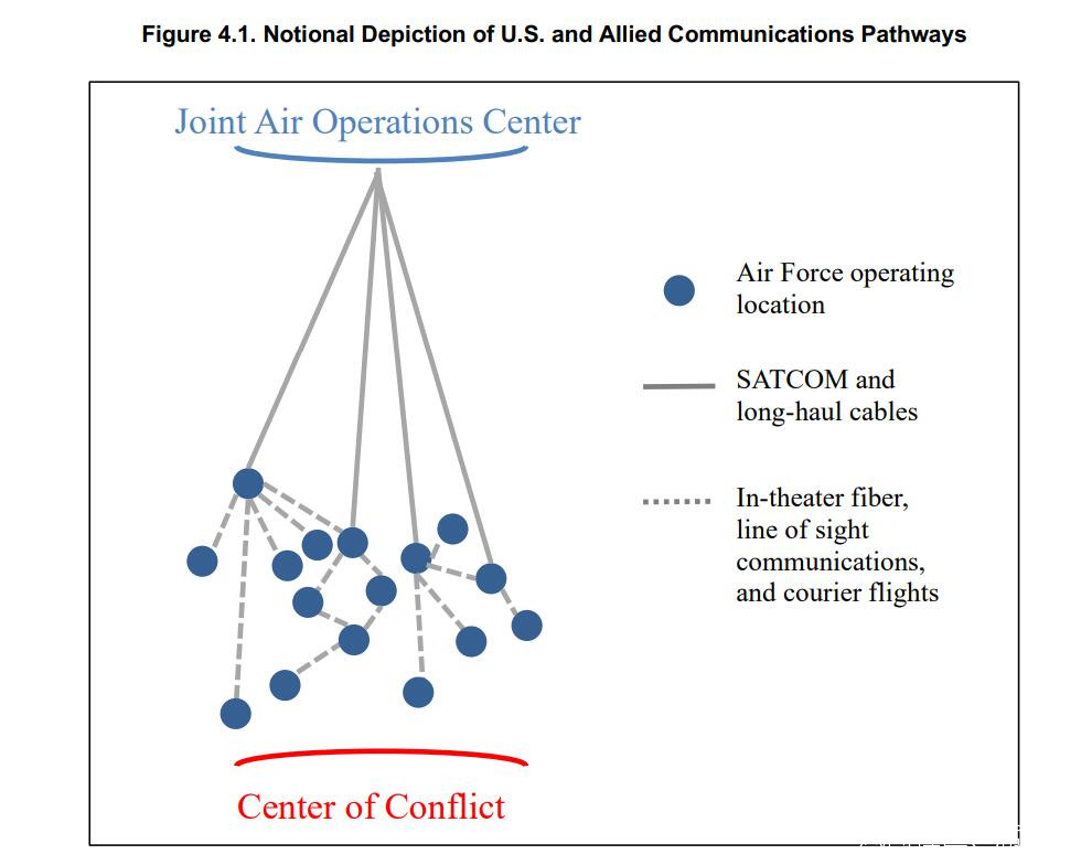 美國空軍認識到,這樣的指揮控制系統在對抗性環境中極易遭到破壞。對聯合指揮中心的物理打擊,或者對遠程通信的干擾都可能讓前線部隊失去制定、執行計劃和對戰役進程進行評估的能力。在印太戰區,舉例而言,前線部隊可能“在戰術戰鬥中,遭遇到與5000英里外的司令部通信受干擾甚至失去通信的情況”,更有甚者,儘管前沿地區的通信應該更加可靠,但事實上即使是局部的通信網也可能出現暫時被幹擾的情況。