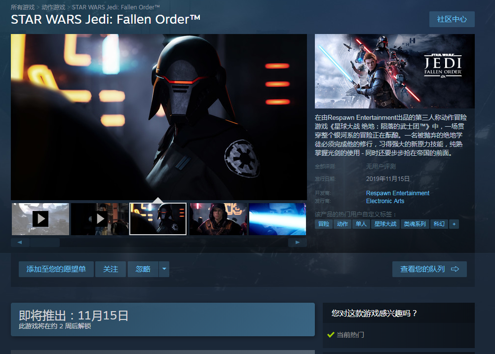 作為迴歸Steam平台後發行的第一部作品,《星球大戰 絕地:隕落的武士團™》的預購已經上線Steam,並將於11月15日解鎖。目前Steam國區售價為全球最低,售價為標準版308元/豪華版368元。另外,本作支持官方簡體中文。
