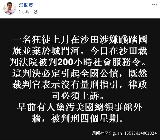 據香港橙新聞10月29日報道,裁判官李志豪指案件性質嚴重,但由於沒有量刑指引,考慮到被告初犯,坦白認罪,還有家人支持,報告正面良好,案情不涉及更嚴重的焚燒國旗,感化官建議160小時社服令,李官則認為須提高時數以反映罪行嚴重性,判處200小時社服令。