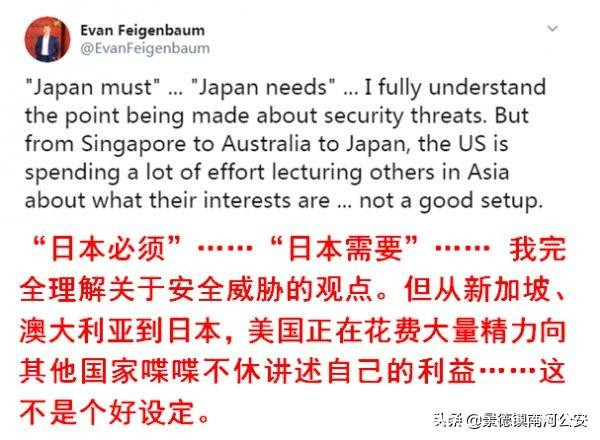 或許由於此番對日喊話姿態過於居高臨下,就連美國國內專家也忍不住表示反感。美國前國務院亞太事務高級官員、卡內基國際和平基金會的埃文·費根鮑姆在社交網站上批評美國對盟友指手畫腳。